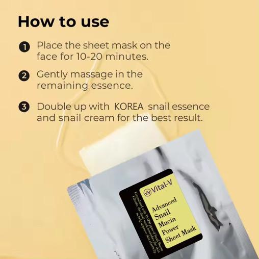 - Luminous Skin Full of Nourishment: Naturally-derived sheet mask drenched with Vital-V bestselling snail 96 mucin power essence delivers rich hydration and nourishment, repairing damaged skin and lightening acne scars.